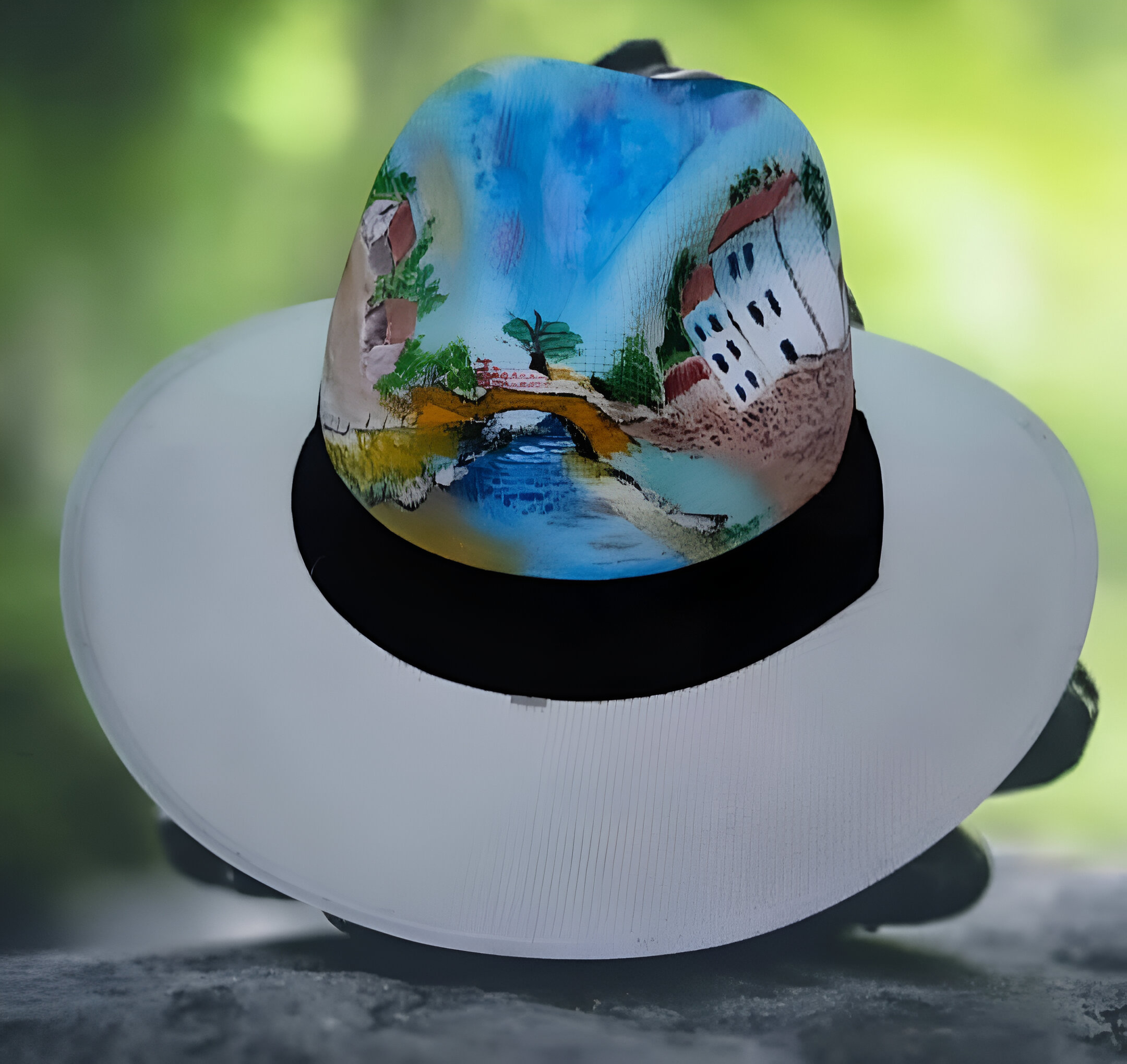 Sombrero artesanal pintado completamente a mano, con un diseño inspirado en paisajes coloniales y colores vibrantes. Cada pieza es única, combinando arte y estilo para quienes aprecian lo hecho con dedicación.